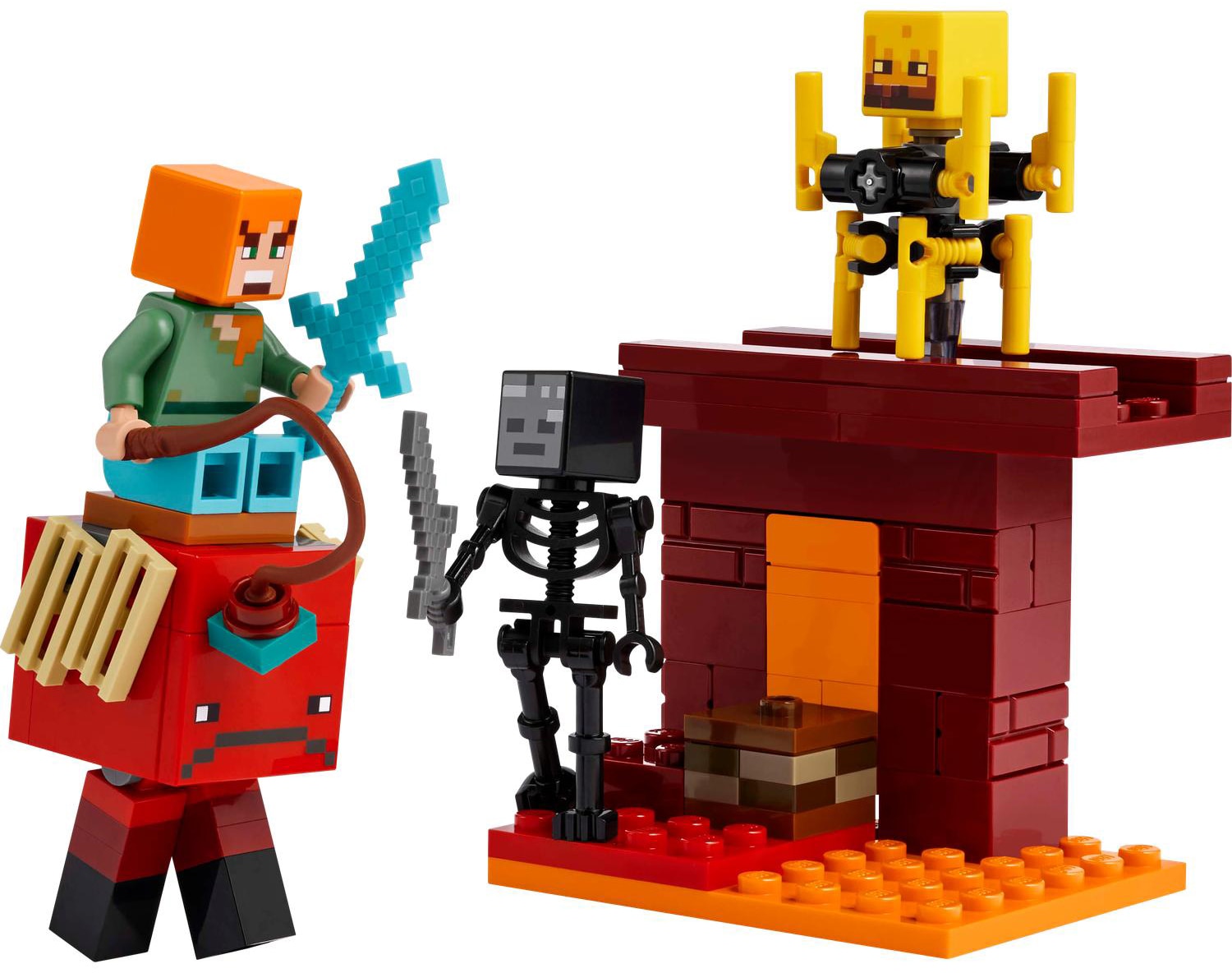 Copiii se alatura eroului de actiune Minecraft Alex intr-o misiune de a indeparta resturile stravechi dintr-o sectiune a podului fortaretei din padurea purpurie din Nether. Cand resturile sunt indepartate, elementele de lava cad automat in cascada, iar figurinele Minecraft – un schelet vestejit care manuieste o sabie de piatra si o valvataie roteste tije – se pun in calea evadarii lui Alex. Copiii folosesc o emblematica sabie de diamant pentru a lupta cu mobii, apoi fug pe o alta figurina Minecraft, un strider, care are picioare articulate si o sa. Jucatorii Minecraft stiu ca trebuie sa ia o ciuperca deformata pentru a putea mana striderul. Pentru un plus de distractie digitala, aplicatia LEGO Builder le permite copiilor sa apropie si sa roteasca modelele in 3D folosindu-si dispozitivele.