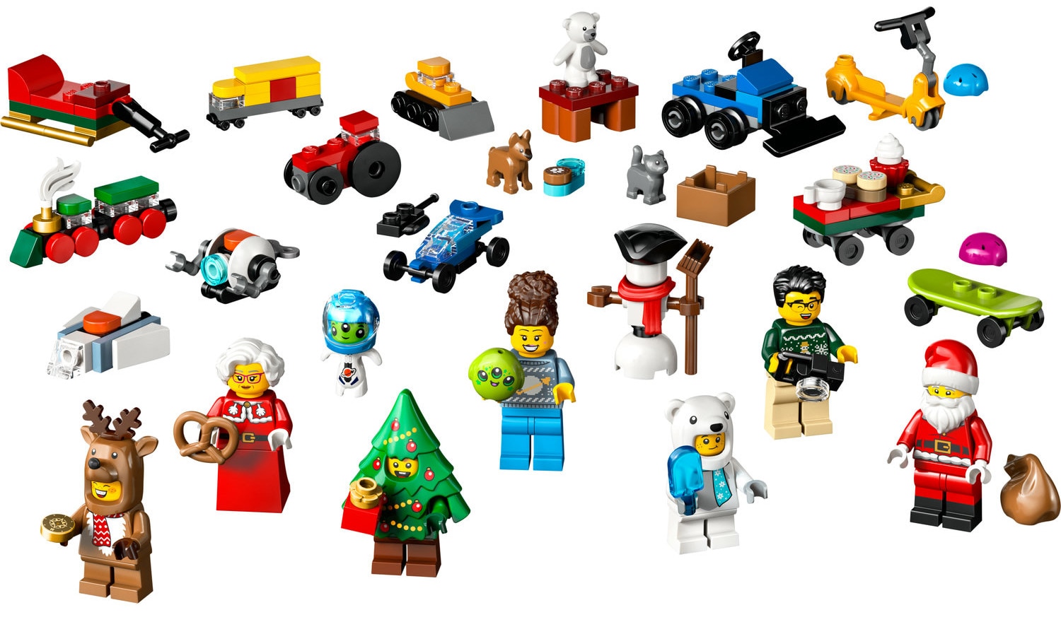 • Set cadou Calendar de advent cu 24 de surprize – Include minifigurinele Mos Craciun si Doamna Craciun, personaje cu costume reprezentand un urs polar, un ren si un pom de Craciun, miniconstructii si accesorii atractive;