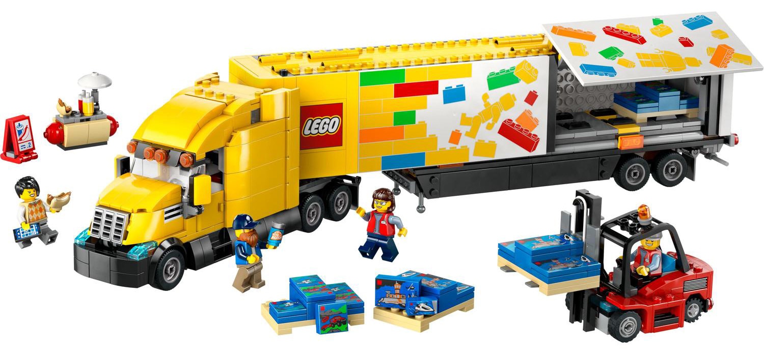 Entuziasmul creste in LEGO® City, unde paletii de seturi de joc sunt gata de livrare. Hotdogii se vand rapid in timp ce echipa pregateste camionul galben de drum. Deschide partile laterale ale remorcii si incarca paletii cu jucarii in compartimentul de marfa cu stivuitorul. Acest camion are chiar si o cabina de dormit pentru calatorii lungi! Verifica motorul, urca si porneste spre autostrada!