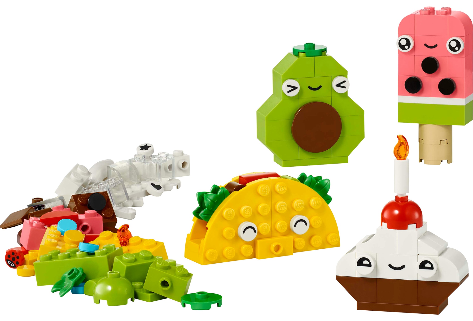 Copiii folosesc seria diversa si colorata de caramizi de constructie si piese speciale, precum ochi, guri si alte elemente decorative pentru a construi 4 simpatici prieteni alimentari: o briosa, o inghetata, un avocado si un taco. Distractia creativa continua cand copiii recombina caramizile pentru a obtine noi modele, precum o prajitura cu bombonele colorate, un ceai cu perle de tapioca, o para si un panini. Pe masura ce copiii devin mai increzatori in abilitatile lor de constructie, pot urma ghidul intuitiv de constructie pentru a modifica expresii, forme sau culori ca sa obtina noi prieteni alimentari, intre care o inghetata verde, o cutie de suc, o felie de pepene verde, un baton de ciocolata si un megasandvis.