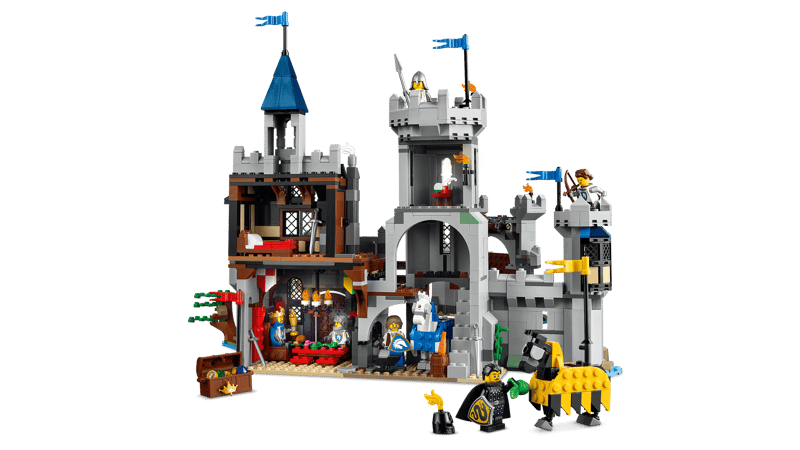 Baietii si fetele de 9 ani si mai mari au de ales intre 3 optiuni de constructie: un castel interactiv, o arena de turnir cu un castel mic sau un oras medieval cu o moara de vant. Fiecare set include 6 minifigurine: un cavaler rege, un cavaler campion, un cavaler arcas, un cavaler lancier, un fierar si un cavaler sarpe, plus 2 cai articulati.