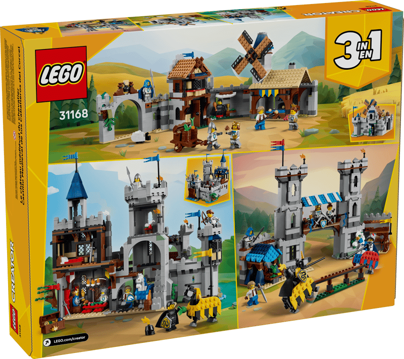 Intoarce-te in timp ca sa ai parte de aventuri la un Castel medieval cu cai si cavaleri! Treci podul mobil si viziteaza dormitorul regelui, sala mare si grajdurile. Urca pe un cal ca sa aperi castelul de alte factiuni! Pentru mai multa actiune medievala, reconstruieste modelul intr-o arena de jocuri cu cavaleri medievali sau intr-un oras medieval cu o moara de vant. Tu alegi in acest set 3 in 1.