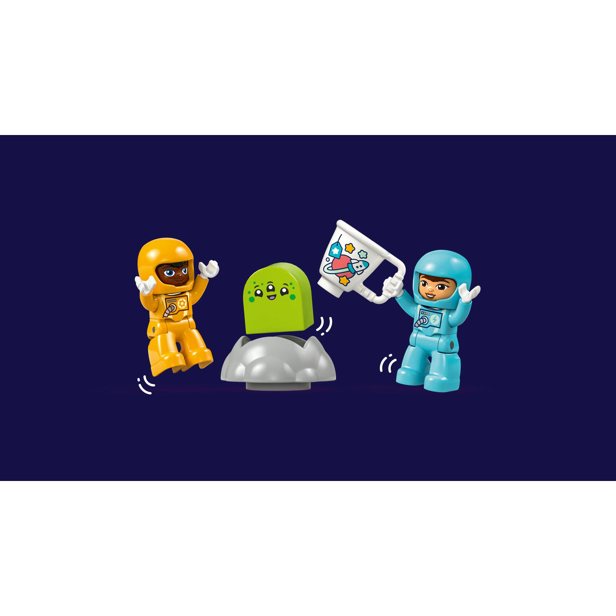 Aceasta jucarie cu tematica spatiala contine o multime de accesorii amuzante care stimuleaza joaca creativa. Prescolarii exploreaza noi orizonturi pe cand inventeaza aventuri distractive in spatiul cosmic pentru cele 2 figurine astronaut LEGO® DUPLO®, cum ar fi imprietenirea cu un extraterestru sau o iesire in spatiu pentru a repara racheta cu cheia mecanica de jucarie.