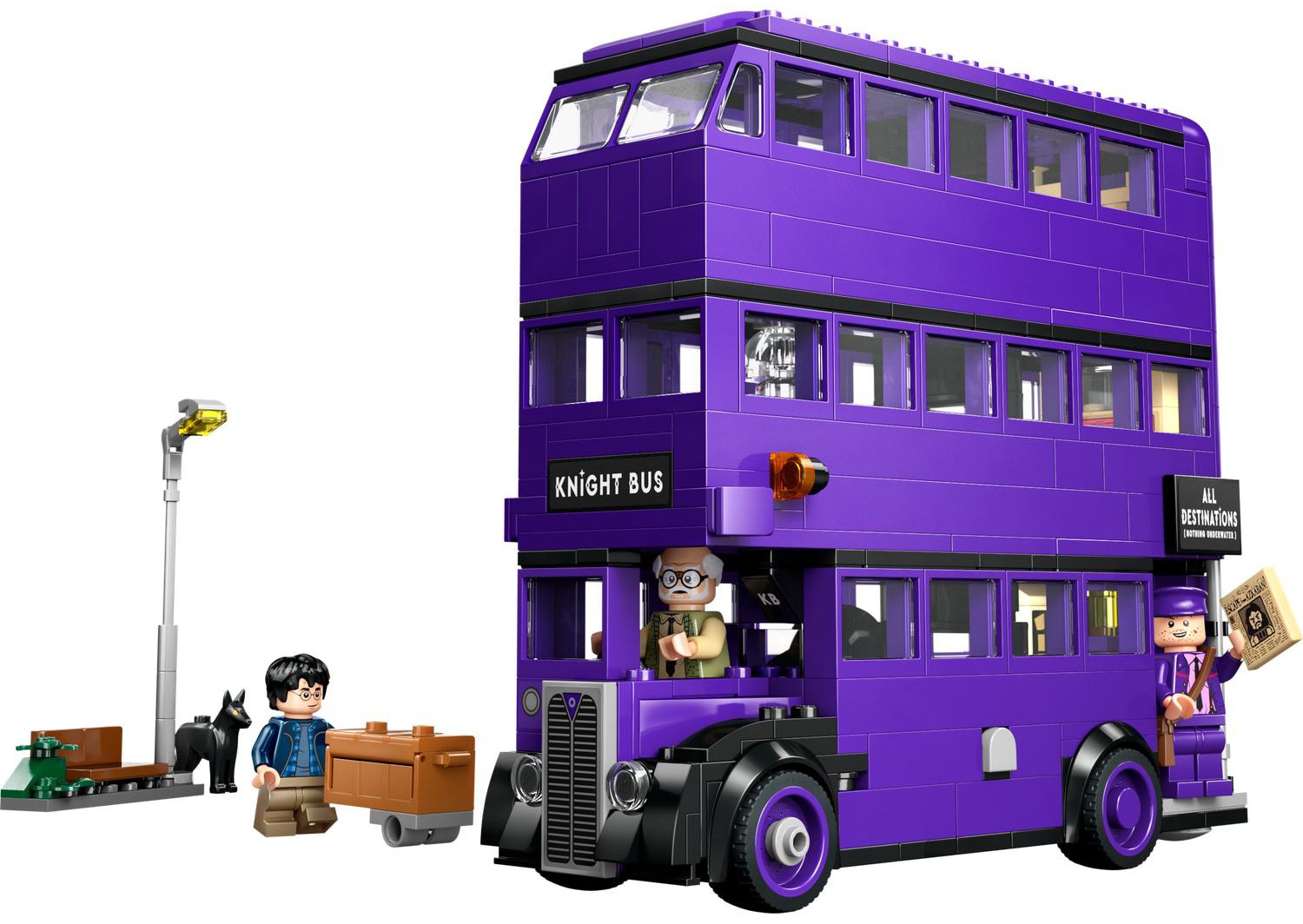 Acest set de constructie cu jucarie magica include si 5 personaje LEGO Harry Potter – Harry Potter, Ernie Prang, Stan Shunpike, o vrajitoare adormita si Padfoot™ – pentru a recrea scene memorabile din Harry Potter si prizonierul din Azkaban™. Alte detalii autentice, intre care un stalp de iluminat construibil unde Harry a asteptat (si a fost speriat de Padfoot!) inainte de sosirea autobuzului Knight Bus, cufarul lui Harry si un element ziar Profetul zilei cu titlul de articol „Evadare din Azkaban” cresc posibilitatile creative de joaca pe roluri.