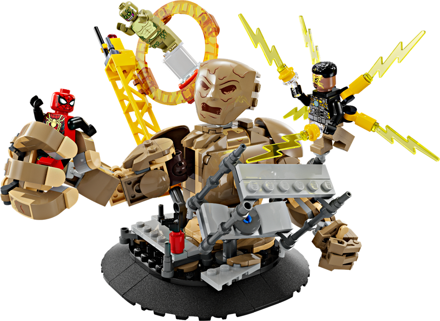 Setul LEGO Marvel multifatetat, construibil, cu Omul Paianjen include 3 ticalosi: Sandman, Electro si soparla (acesta este primul kit LEGO Marvel care include minifigurina soparla). Avand mai multe locuri pentru plasarea minifigurinelor, posibilitatile pentru joaca si etalare sunt nelimitate. Copiii pot rasuci si roti minifigurina articulata reprezentandu-l pe Sandman si pot folosi mainile sale enorme ca sa-l prinda pe Omul Paianjen in timp ce acesta sare pe deasupra, agatat de „franghia” sa flexibila din panza de paianjen. Ei pot extinde jucaria Marvel construibila combinand-o cu setul Lupta finala a Omului Paianjen (76261), vanduta separat. Pentru mai multa distractie digitala, constructorii pot apropia si roti modelele in 3D si-si pot monitoriza progresul folosind aplicatia interesanta si intuitiva LEGO Builder.