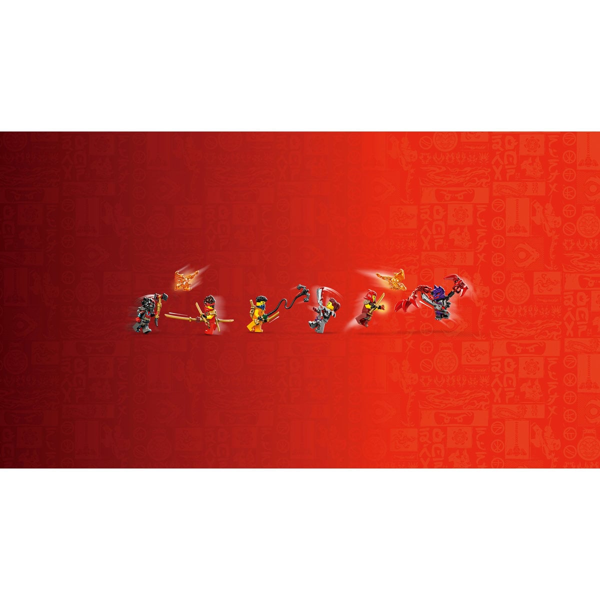 Acest set cu dragon de jucarie include 6 minifigurine cu care copiii interpreteaza batalii: razboinicii ninja Kai, Wyldfyre si Arin (cu accesorii cool sub forma de sabie si arma) si trioul de ticalosi format din Lordul Ras, Jordana si un Razboinic cu masca de lup, care au fiecare propriile arme.