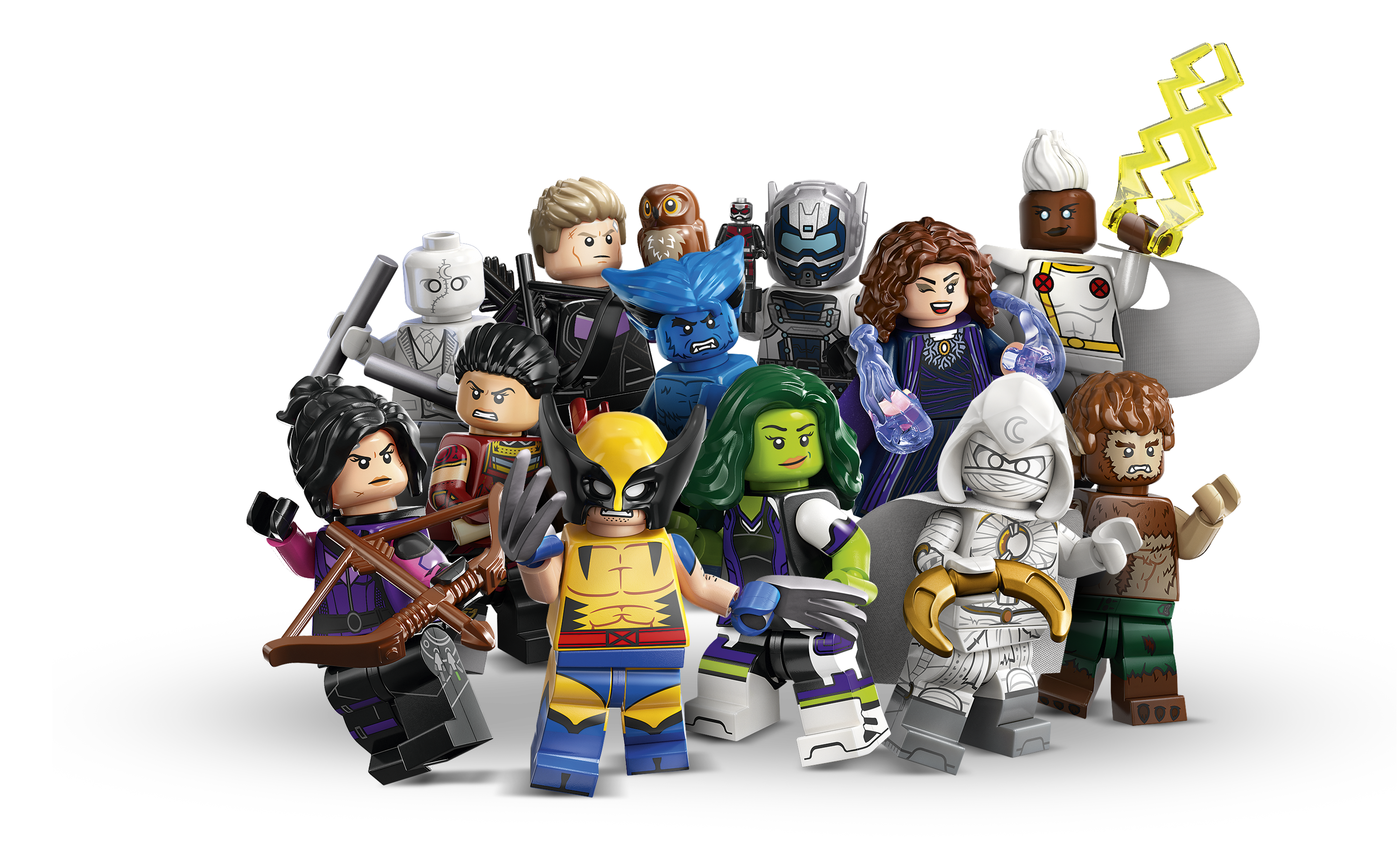 Micii constructori vor fi incantati sa descopere ce personaj Marvel se afla in cutia lor sigilata, sustenabila. Colectia include 12 personaje unice: Agatha Harkness, Kate Bishop, Hawkeye, Moon Knight, Mr. Knight, Femeia-Hulk, Werewolf, Goliat, Storm, Beast, Wolverine si Echo.