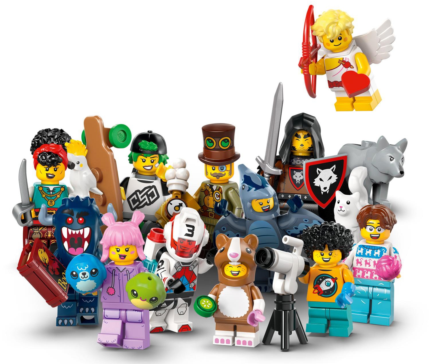 Fiecare cutie contine 1 minifigurina LEGO surpriza, in total fiind 12 personaje de colectionat: Stapanul lupilor, Pirat comandant secund, Inventator Steampunk, Fan in costum de pterodactil, Baubau, Pilot de curse cu rucsac cu propulsie, Iubitor de pisici, Practicant de longboarding, Pusti astronom, Cupidon, Fan in costum de hamster si Colectionar de jucarii de plus.