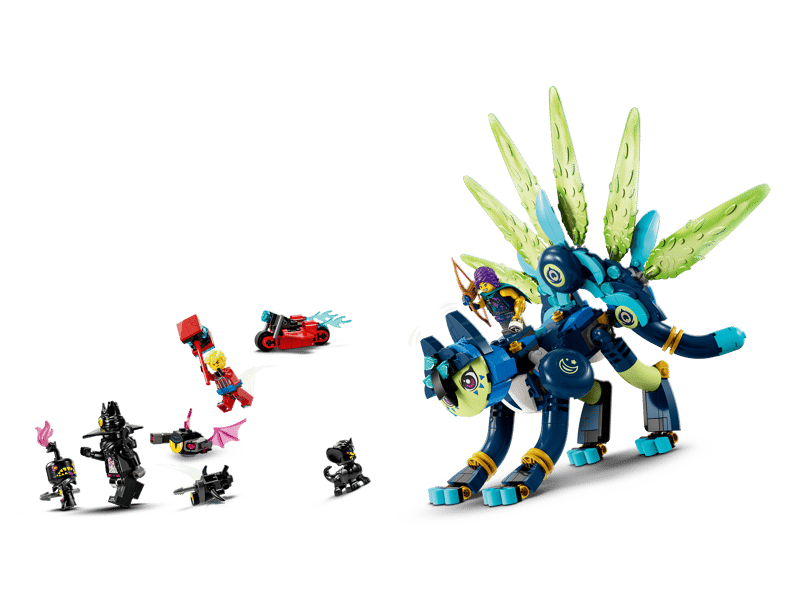 Ajut-o pe eroina LEGO® DREAMZzz™ Zoey sa-l salveze pe partenerul sau Zian de ticalosul Vanator al Noptii! Construieste-l pe Zian ca pe o pisica-bufnita rapida, cu aripi, sau ca pe o pisica-paun cu o coada frumoasa. in modul pisica-bufnita, Zian poate zbura din calea creaturilor de cosmar, iar in modul pisica-paun, poate lupta cu ele! Va veni Zoey sa-l salveze? Numai tu poti decide...
