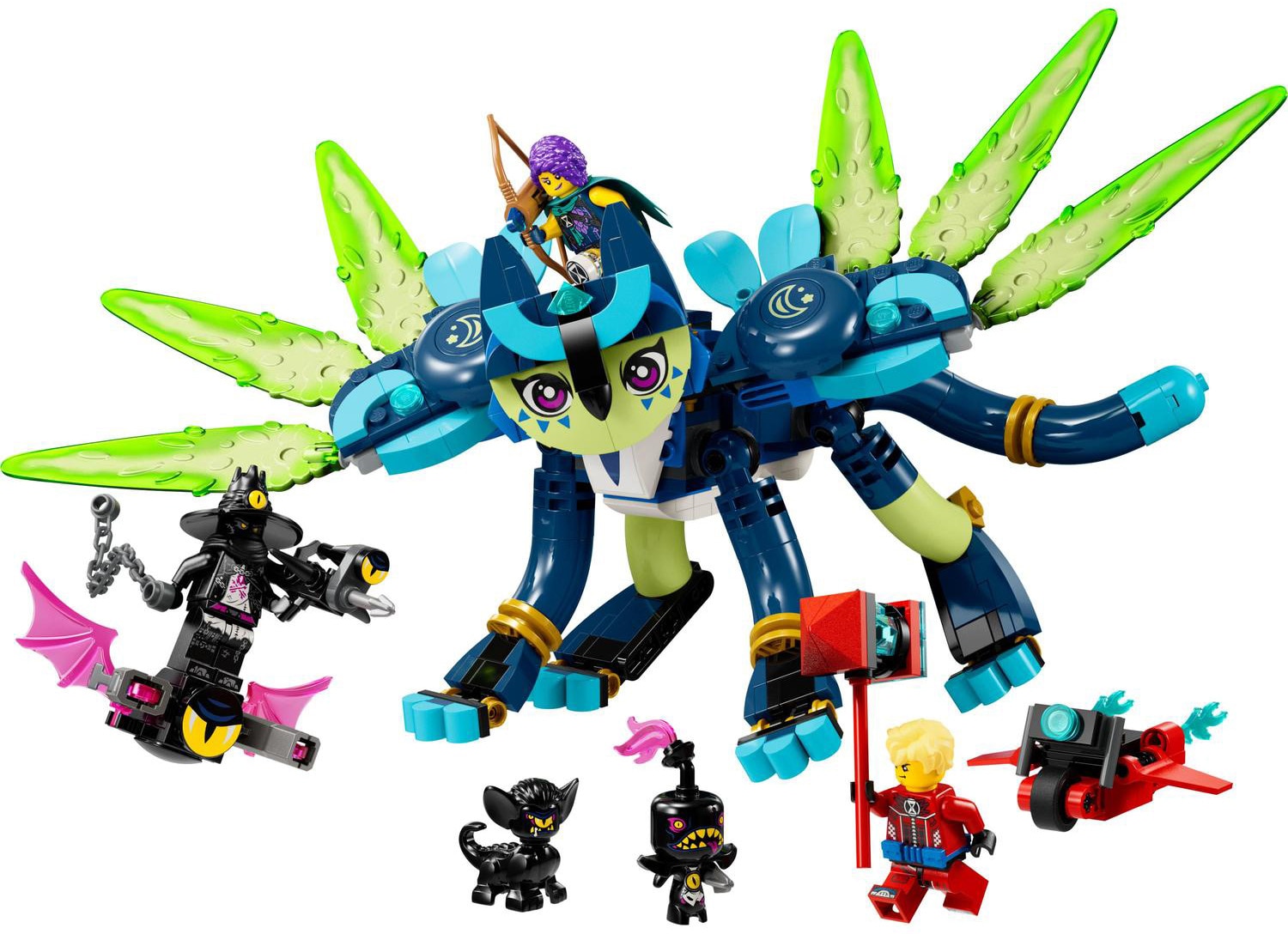 Actiunea prinde viata cu ajutorul a 3 minifigurine: Zoey, Cooper si Vanatorul Noptii, plus minionii lui Sneak si Snivel. si, cu accesorii cool precum arcul cu sageti al lui Zoey si motocicleta zburatoare a lui Cooper, aceasta jucarie fantastica incurajeaza copiii sa recreeze scenele lor favorite si sa viseze unele noi timp de multe ore de joaca fantezista si palpitanta.
