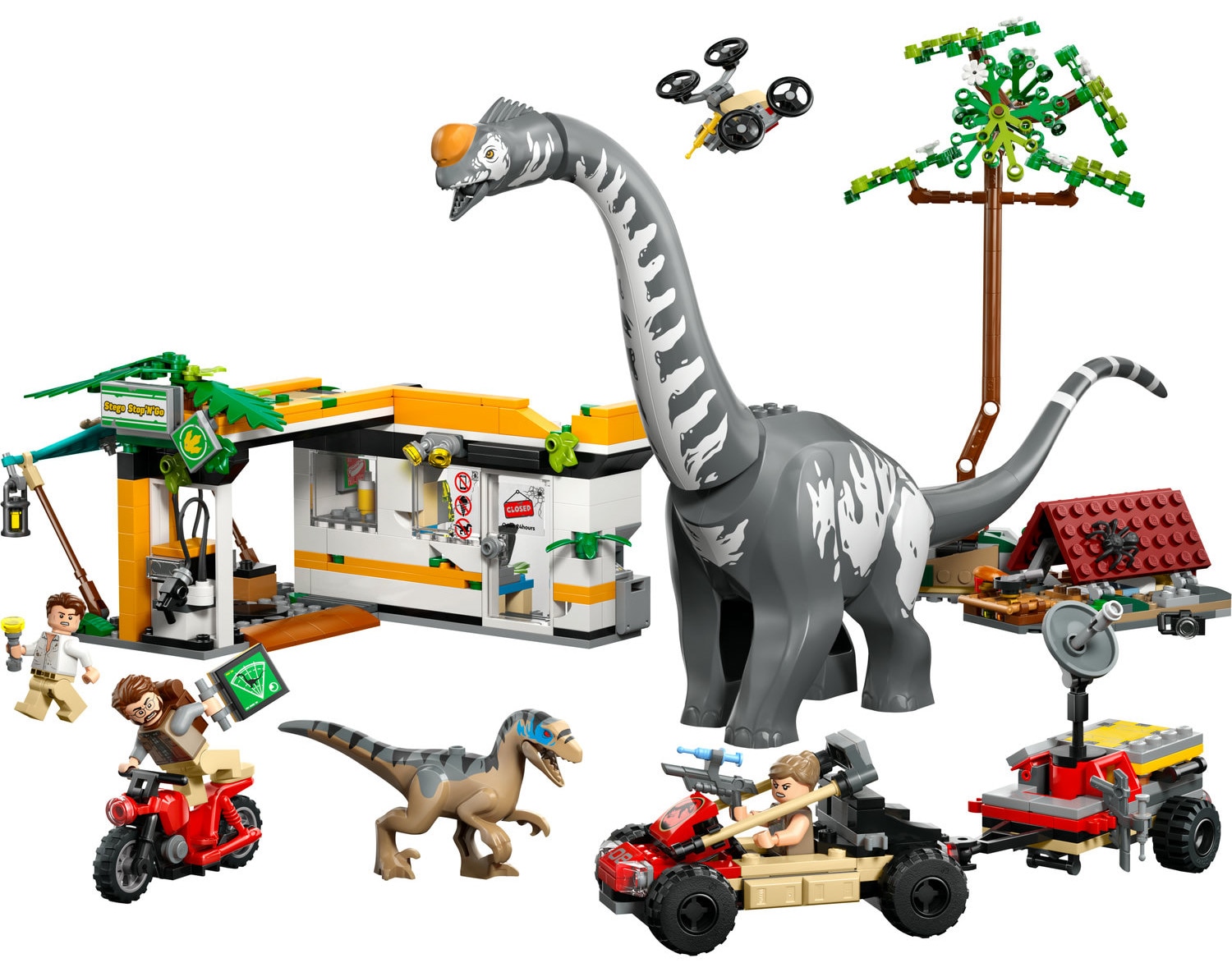 • Set detaliat – Acest set LEGO® Jurassic World include o statie de incarcare cu articole pentru a crea noi povesti, o zona de campare si un copac, o motocicleta mica, o drona si un vehicul off-road cu remorca;